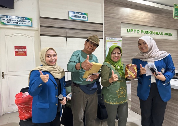 Usai pembukaan, dilakukan penyerahan plakat dari Kaprodi dan Wakaprodi MKM kepada Kepala Puskesmas Jiken sebagai simbol kolaborasi antara institusi pendidikan dan layanan kesehatan daerah. Momen ini dilanjutkan dengan sesi foto bersama tenaga kesehatan, mahasiswa, dan peserta Prolanis. Pada rangkaian kegiatan edukasi, peserta mengikuti pre-test sebelum menerima penyuluhan untuk mengukur pengetahuan awal terkait penyakit kronis. Narasumber dari mahasiswa MKM Undip kemudian memberikan materi mengenai pola hidup sehat, pencegahan PTM, serta pentingnya deteksi dini. Peserta juga menerima leaflet edukatif dan terlibat dalam diskusi interaktif serta sesi tanya jawab. Selain edukasi, peserta memperoleh layanan pemeriksaan kesehatan gratis berupa pengecekan kadar gula darah dan asam urat sebagai bagian dari upaya deteksi dini faktor risiko PTM. Di akhir sesi, peserta mengisi post-test untuk mengetahui peningkatan pemahaman setelah mengikuti kegiatan.Kepala Puskesmas Jiken memberikan apresiasi terhadap pelaksanaan program. “Kolaborasi ini sangat membantu kami dalam memperkuat upaya edukasi kesehatan dan memberikan dampak positif bagi masyarakat,” ungkapnya. Antusiasme warga terlihat dari tingginya partisipasi masyarakat yang hadir sejak pagi hari. Program “Jiken Cerdas” diharapkan dapat dilaksanakan secara berkelanjutan dan menjadi bagian dari upaya bersama antara FKM Undip dan layanan kesehatan daerah dalam meningkatkan kualitas hidup masyarakat. Melalui kegiatan ini, mahasiswa MKM FKM Undip turut berkontribusi dalam memperkuat kapasitas kesehatan masyarakat dan mendukung tercapainya tuju